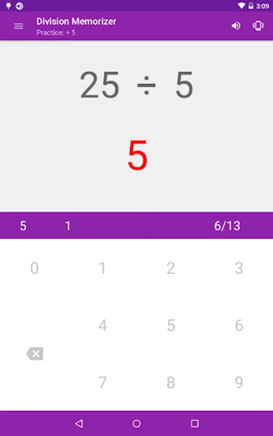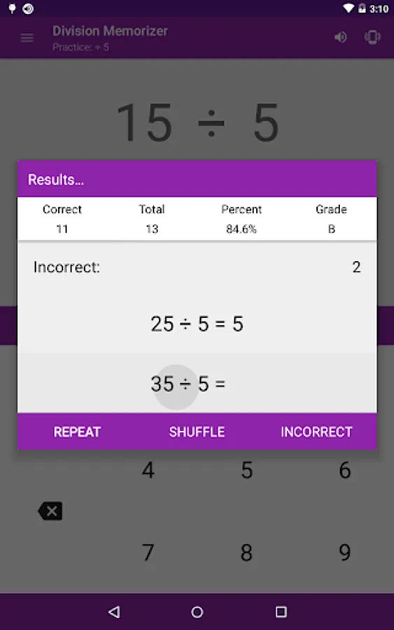 Practice is where your division memorization is tested. Questions are randomly generated. It's your job to enter the answer digit by digit (there is no multiple choice). The number of correct and incorrect attempts are tracked and saved for each division fact. Incorrect problems are listed at the end of each session and you'll have the option to repeat all the questions, repeat only on the incorrect attempts, or shuffle the questions all together.