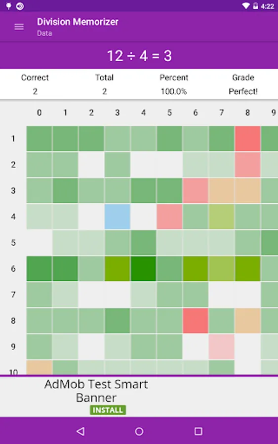 Data is where you can see how you're doing for each division fact. The result for each fact is displayed as a colored box inside a division chart. The colors range from green to red (with green meaning good and red meaning not-so-good). Pressing a box will show more details for that fact: Number Correct, Total Attempts, Percentage, and Grade.