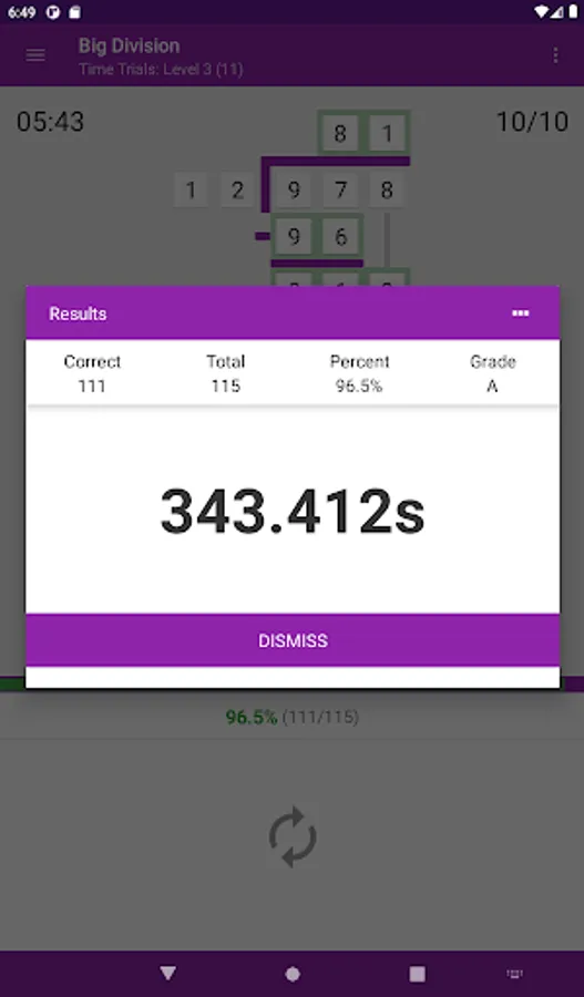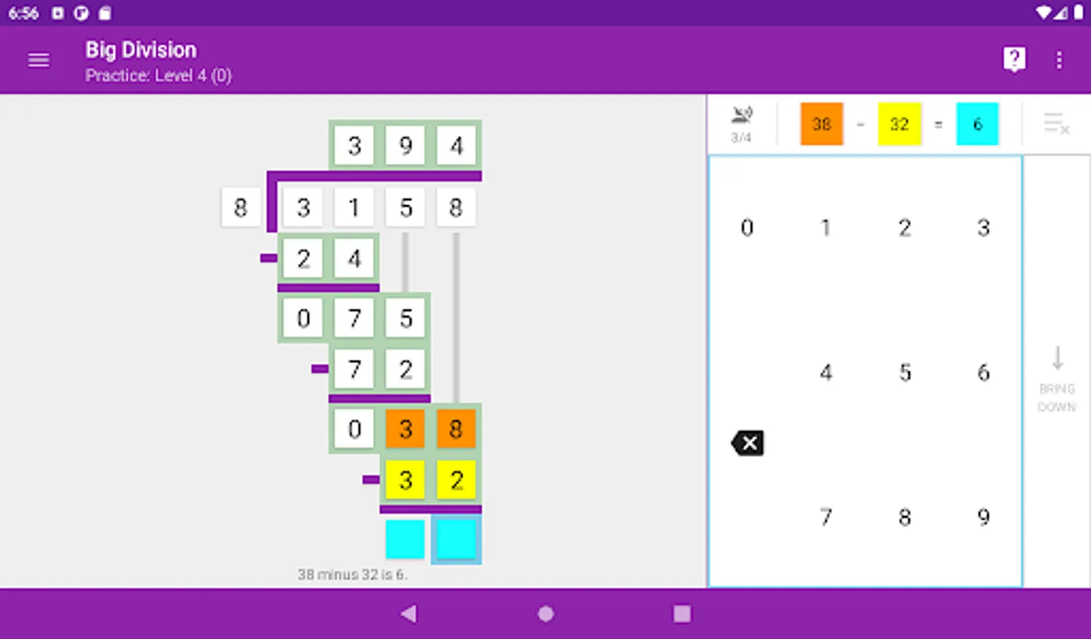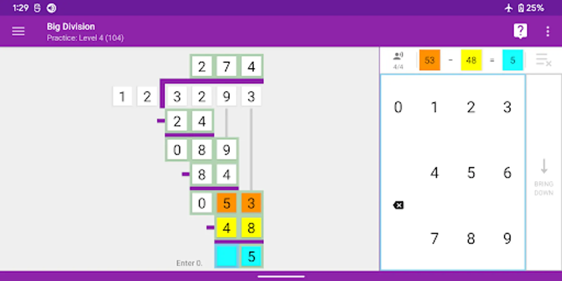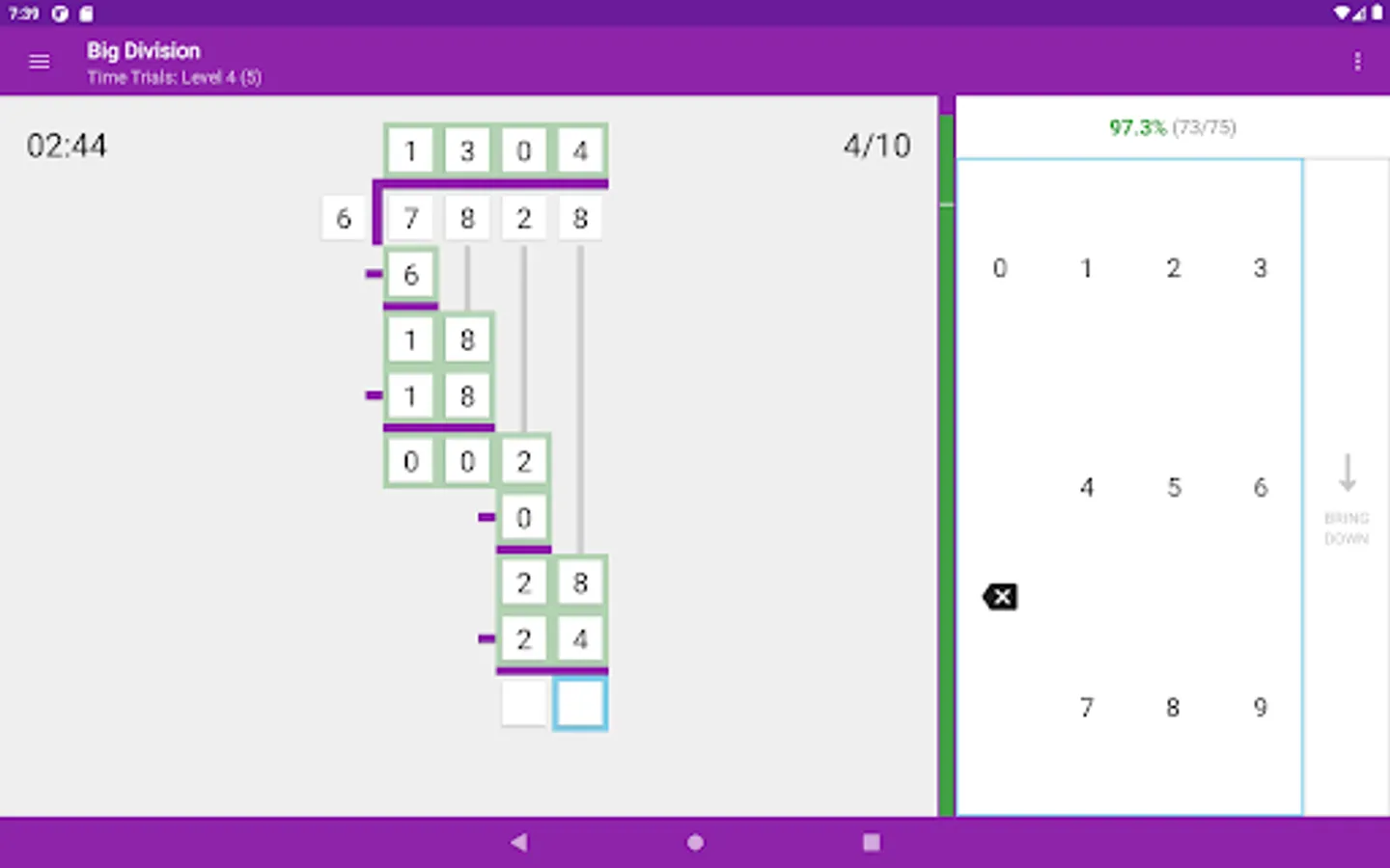As you can see, a long division problem is made up of several division, multiplication, and subtraction problems, so Big Division also is an excellent source for improving and maintaining basic arithmetic speed and accuracy. By using Big Division, you can get your daily dose of math brain training exercises that can help you pass a test, perform quick calculations at work, at home, while shopping, or anywhere you need to solve simple, easy, math problems.