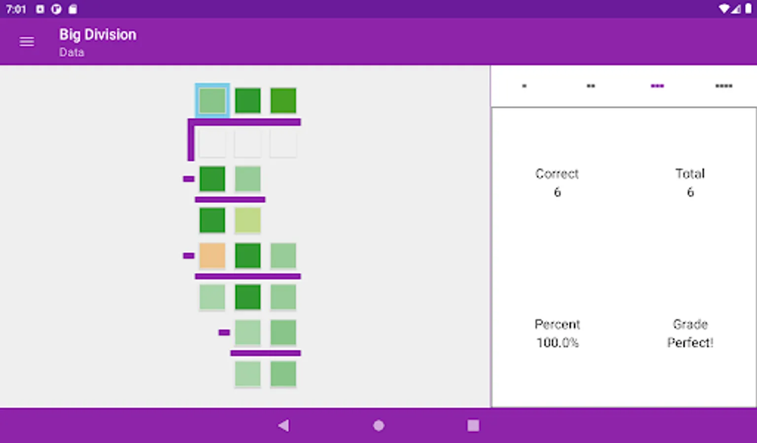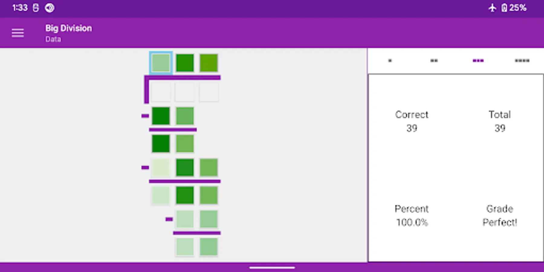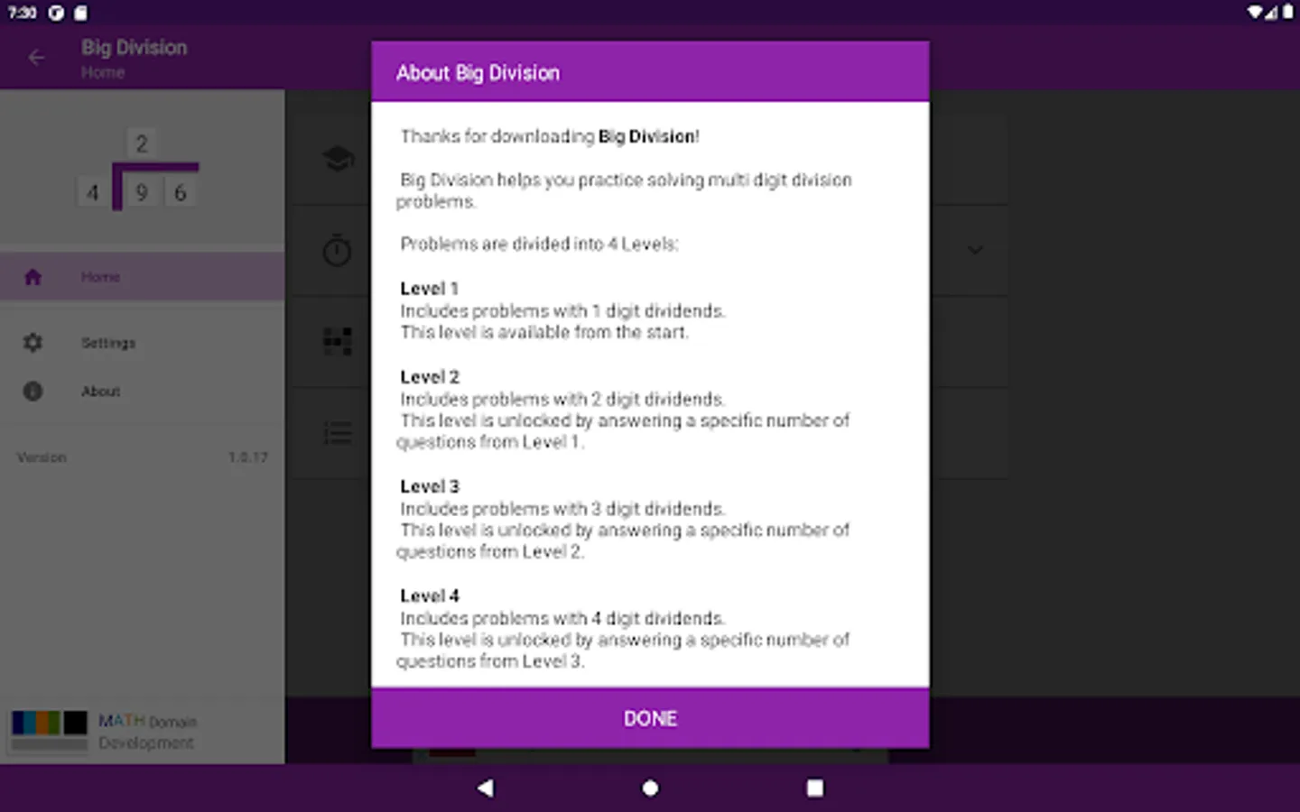 The problems in Big Division are divided into 4 levels, with each level representing the size of the dividend; Level 1 problems have single-digit dividends, Level 2 problems have 2-digit dividends, and so forth up to 4-digit dividends. Larger problems are unlocked by solving smaller problems.