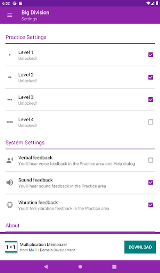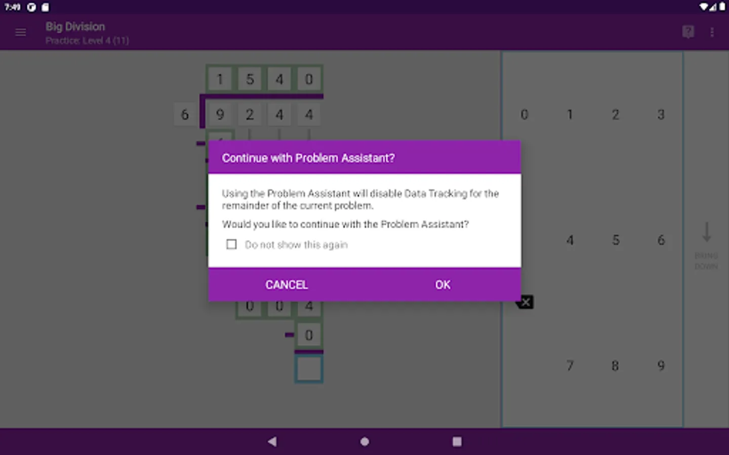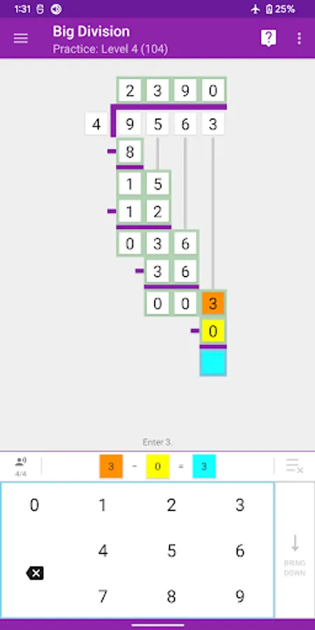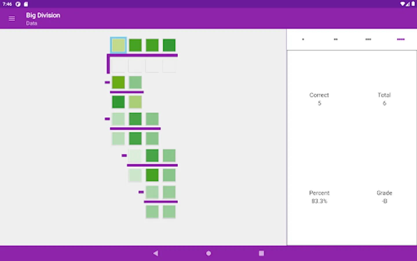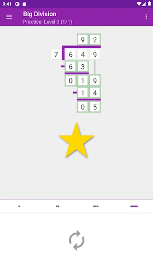 The problems in Big Division are divided into 4 levels, with each level representing the size of the dividend; Level 1 problems have single-digit dividends, Level 2 problems have 2-digit dividends, and so forth up to 4-digit dividends. Larger problems are unlocked by solving smaller problems.