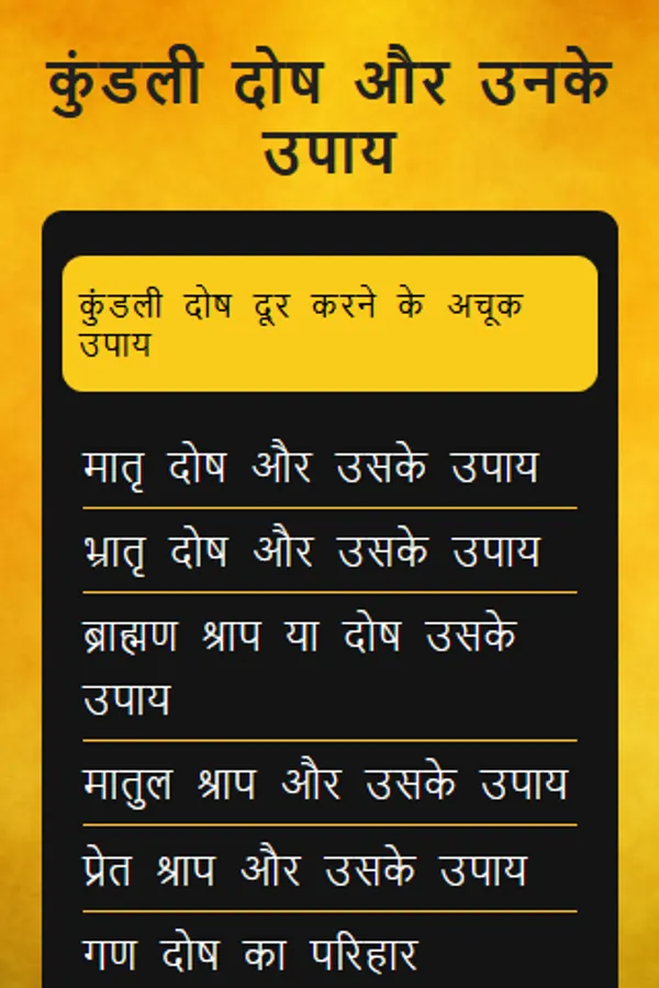 Get this astrology app and know if you have any kundli dosh like shani sade sati, mangal dosh, rahu dosh, ketu dosh, kaal sarp dosh and get remedies for your kundli dosh and instant relief and better influence of grah.