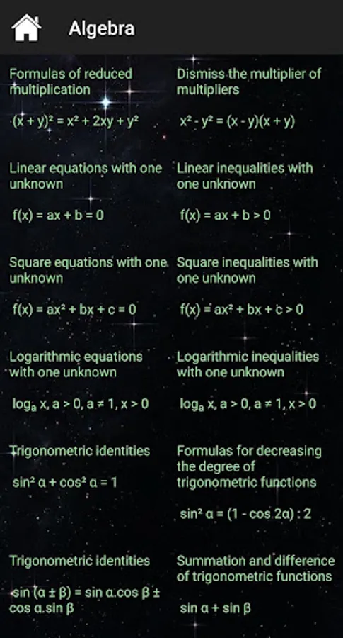 The app contains only the essential and important elements relevant to the course content and in particular the most used formulas in Algebra and Geometry to ensure quick and easy use.