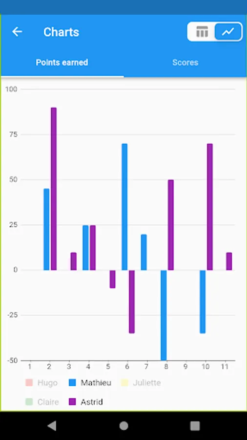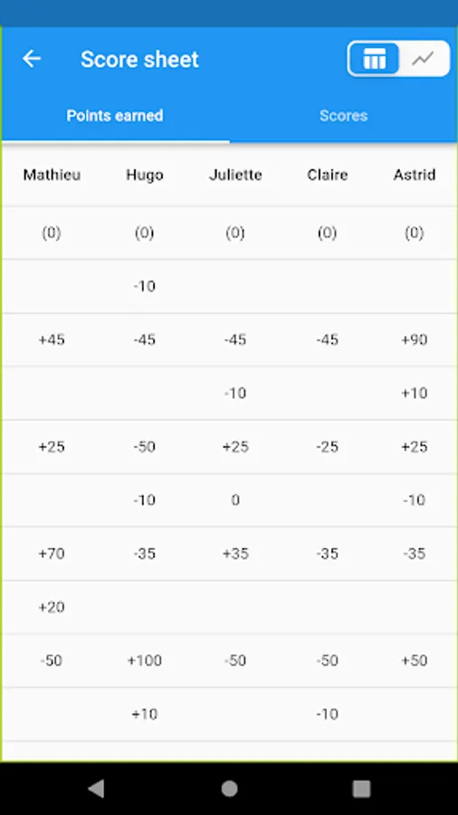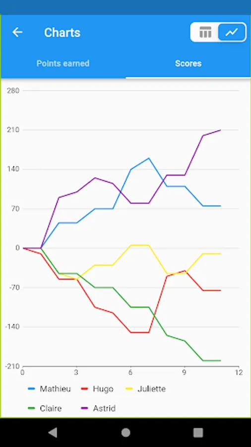 Colorful charts and score sheets let you visualize game progress over time in various ways.