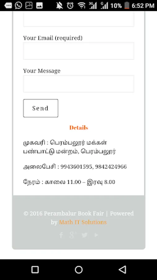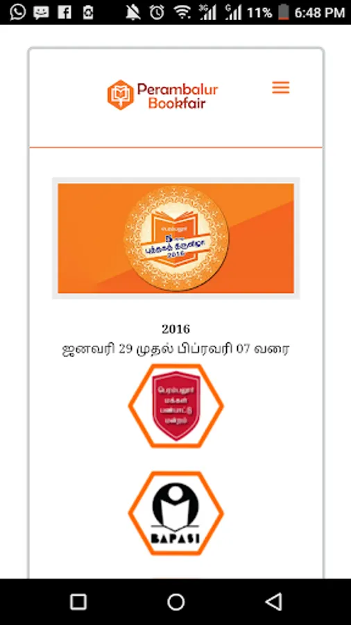 The purpose of this application is to provide all the information about Bookfair that held at Perambalur district. It has all the information like schedule, speakers, gallery (Video, Audio, Images) of that has bookfair shows, Speeches and special programs that held at bookfair. This app has the contact form which helps the users to suggest some ideas and requests and feed backs.
