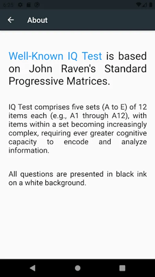 Well-Known IQ Test is based on John Raven's Standard Progressive Matrices. All questions are presented in black ink on a white background.