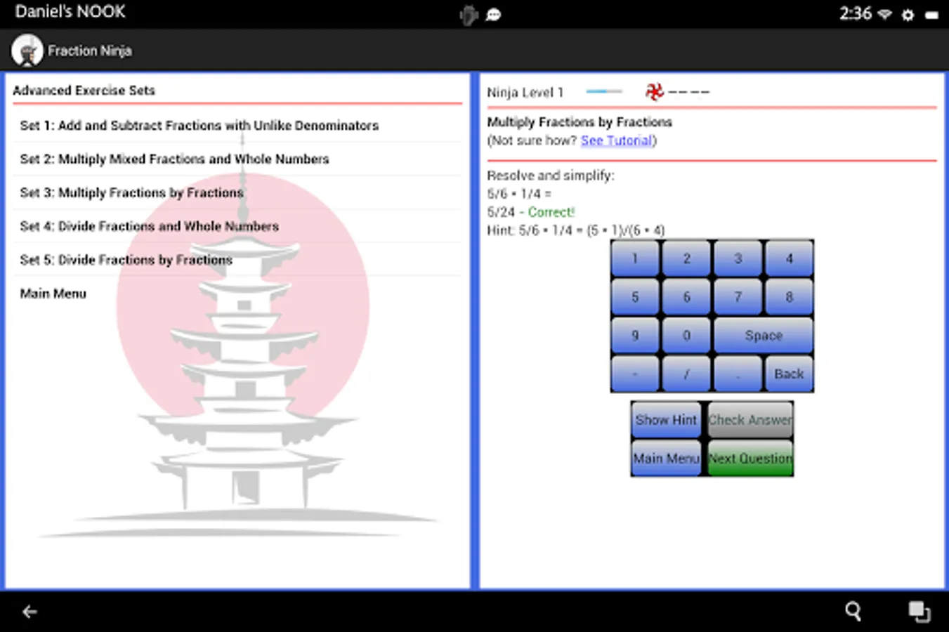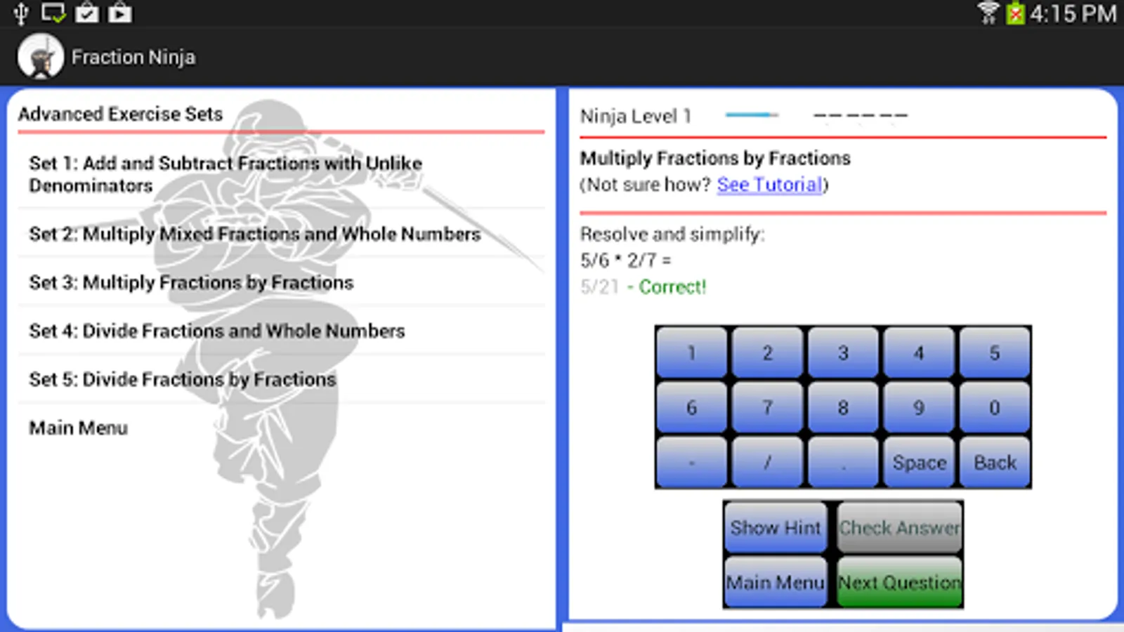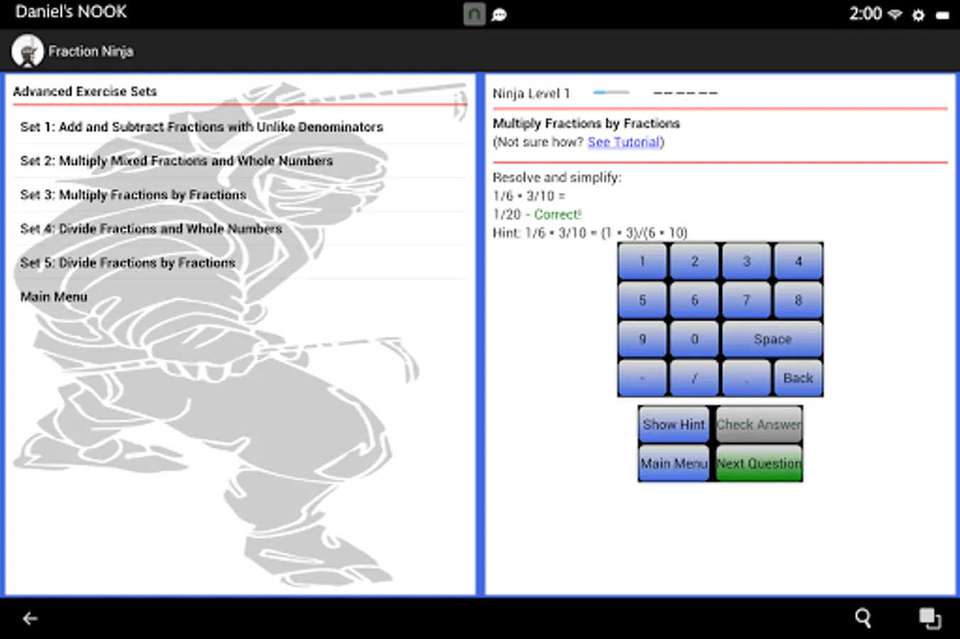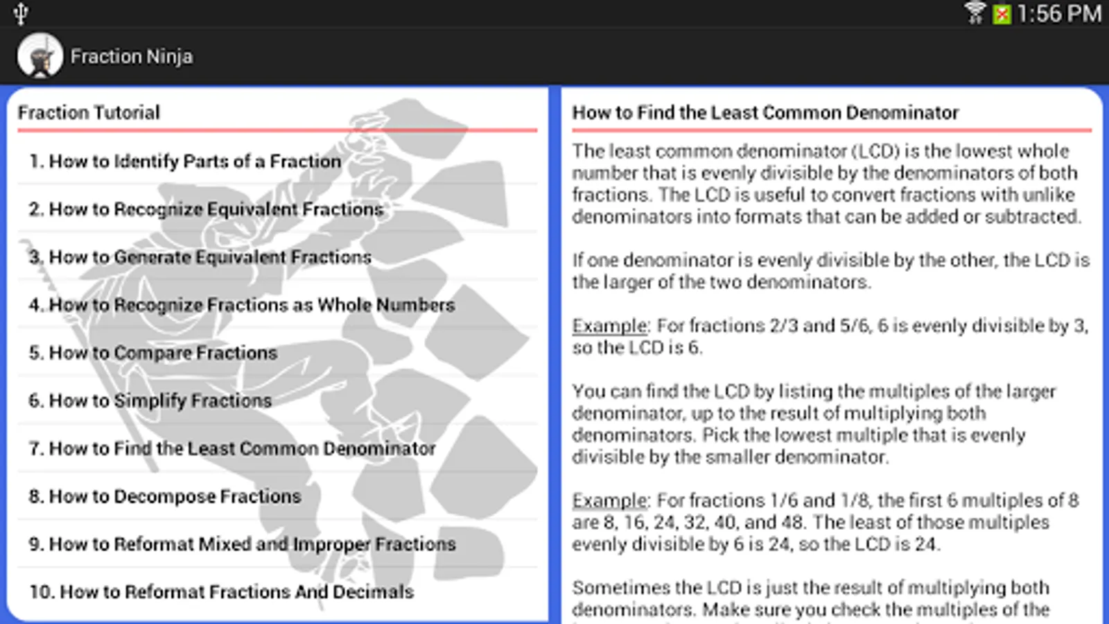Fraction Ninja includes a tutorial on over a dozen topics, including how to identify parts of a fraction, how to compare fractions, how to find the least common denominator, and how to add, subtract, multiply and divide fractions. Students will learn everything they need to know to solve the math problems.