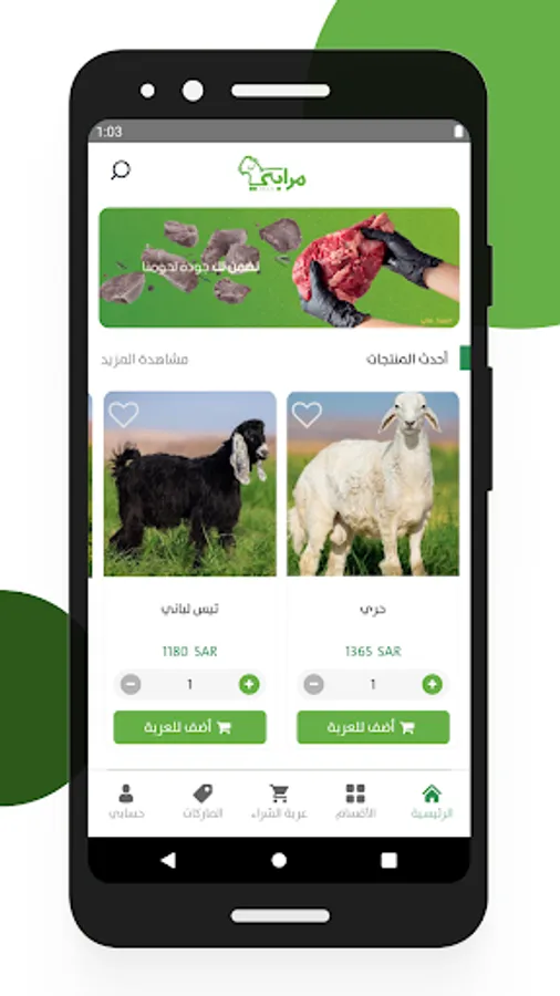 تطبيق مرابي هو خدمة مميزة ومبتكرة تسهل عليك عملية شراء الذبائح من مزارعها الخاصة وتضمن لكم جودة التربية ومستوى النظافة العالي وتوفر الوقت والجهد للعملاء. الذبح والسلخ تحت اشراف طبي في مسالخ البلدية والتغليف والتوصيل يتم بعناية ب سيارات مبردة ومخصصة لذلك. يميزنا_مرابي