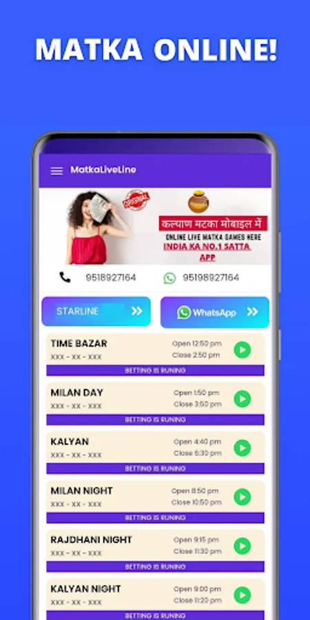 Matka Live Line is India's No. 1 Online Matka App! It provides all Matka results, including Kalyan, Time Bazar, Milan Day, Milan Night, Rajdhani Night, Kalyan Night, Main Mumbai, Star Kalyan. We also do provide the best Matka results.