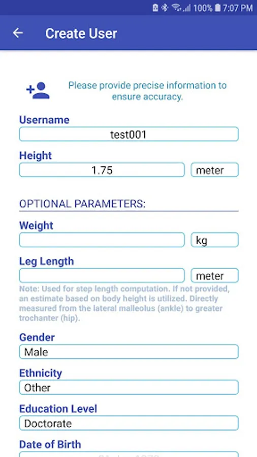 * Just provide your body height and get started! Other optional demographic information can be provided, and will allow you to compare your walking characteristics to other gender- age- location- matched individuals (coming soon!).