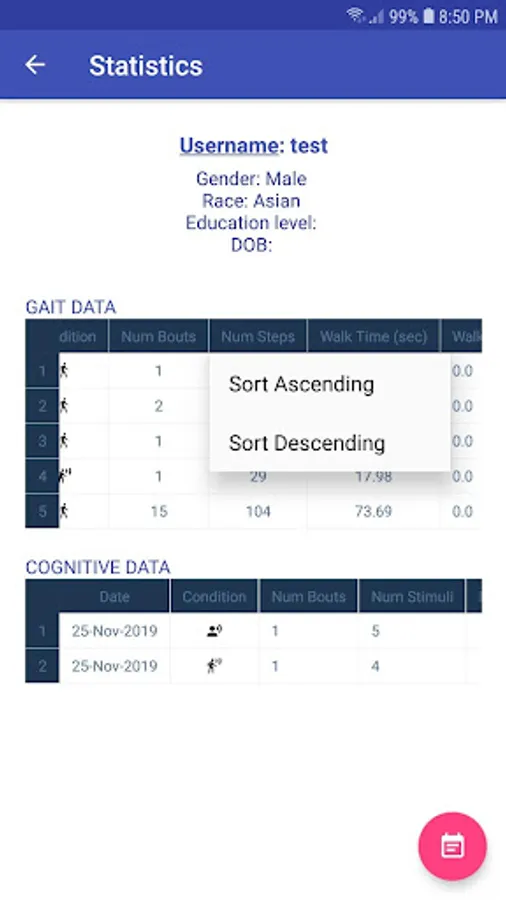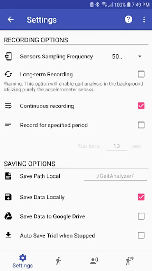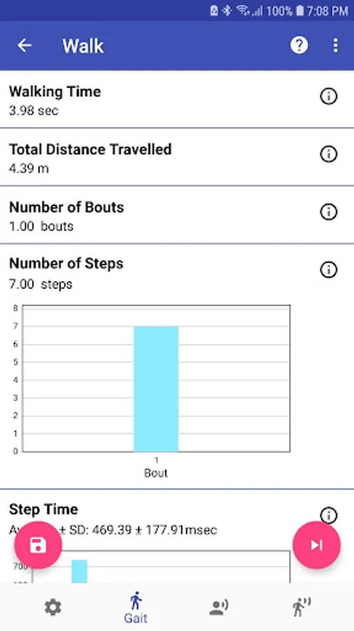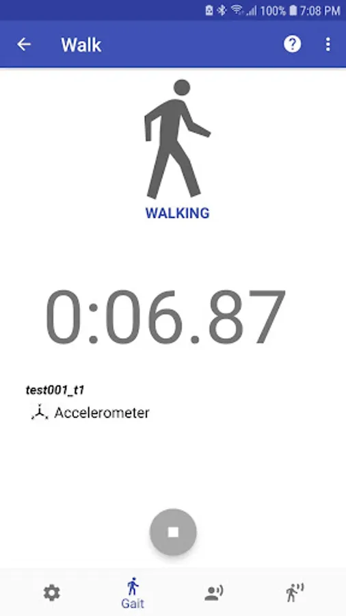 * Computed gait data can be calculated over a given duration (e.g. 10 second trials), continuously until stopped, and even run all day in the background of your phone (In beta testing now)!