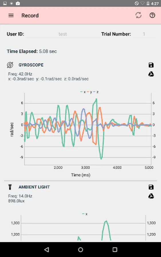 SAVE TO FILE or DRIVE: All data can be automatically saved to your device or to Google Drive in a tab-delimited .txt file to allow for further analysis.