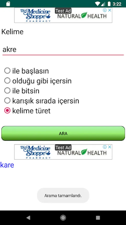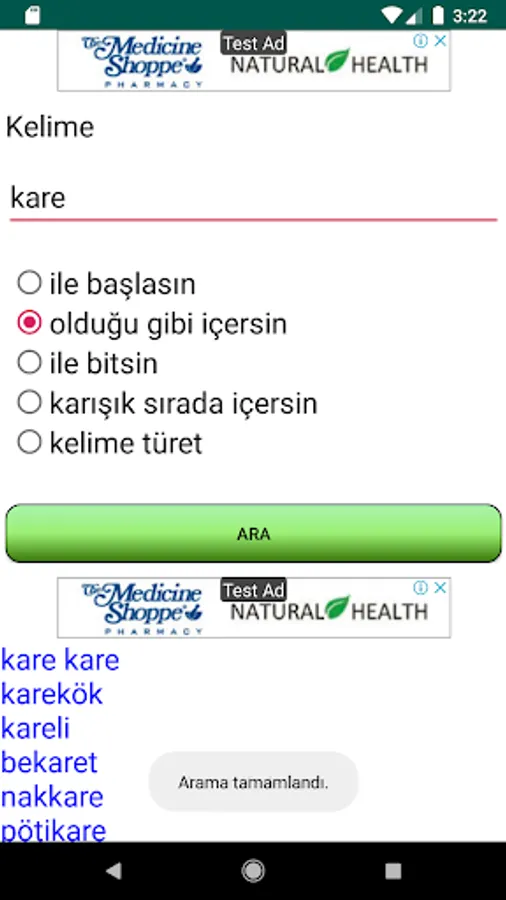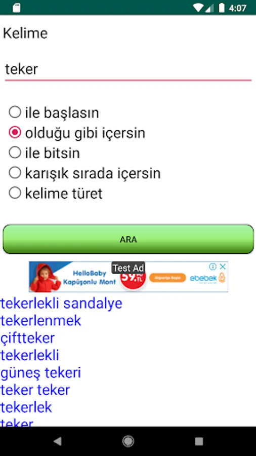 With the application you can perform searches that contain the desired words or letters from Turkish words.