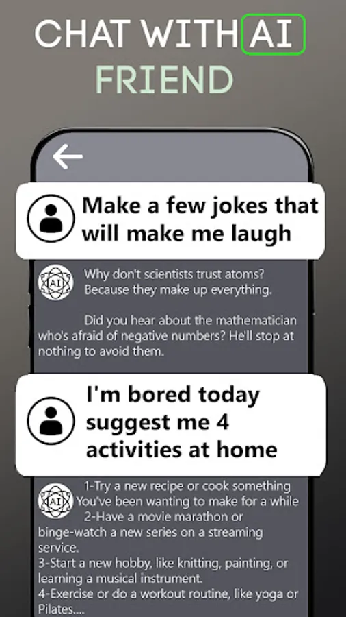 Download Ask Me now and embark on a transformative conversational adventure. Our AI harnesses OpenAI's GPT-3.5 API to empower your interactions, ensuring your experience is unparalleled. Note that Ask Me is an independent creation, leveraging OpenAI's technology for innovation. Explore limitless possibilities with our subscription plans that grant you access to all features.