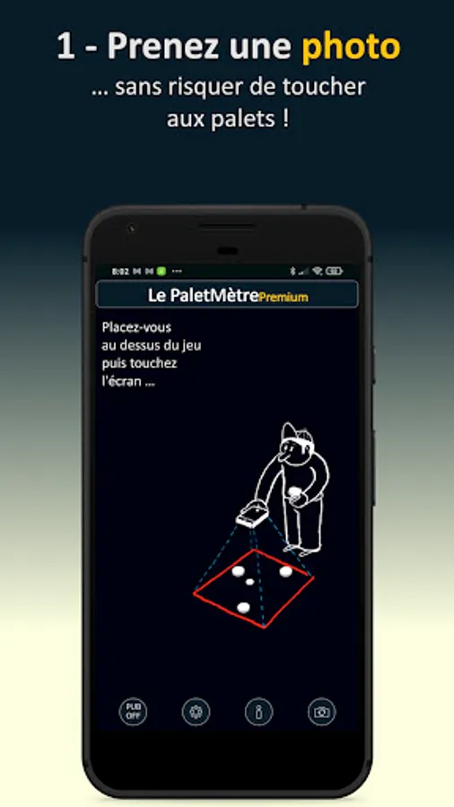 1 - thanks to the bubble level, the image capture above the game is automatic (only if your smartphone has a gyroscope - otherwise manual image capture)
