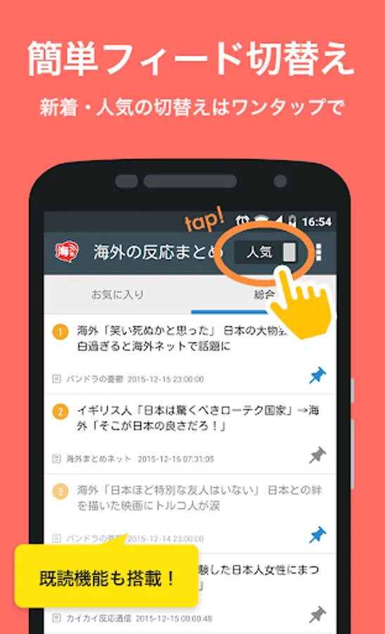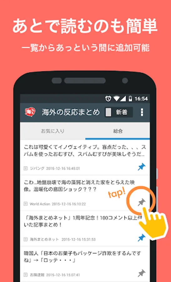 あとで読みたい記事は一覧画面でさっと登録ができ、お気に入りとの使い分けもできます。