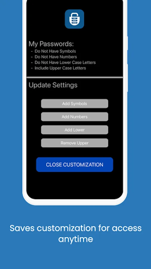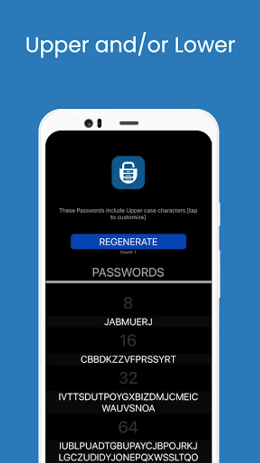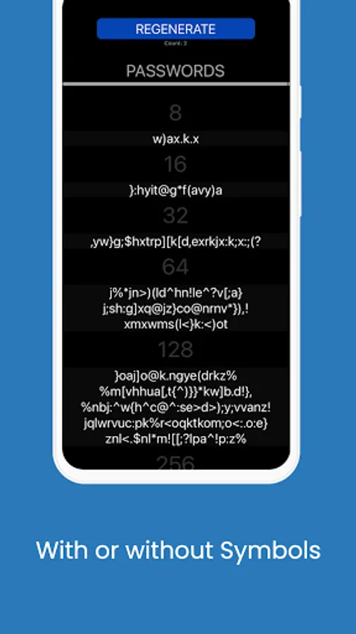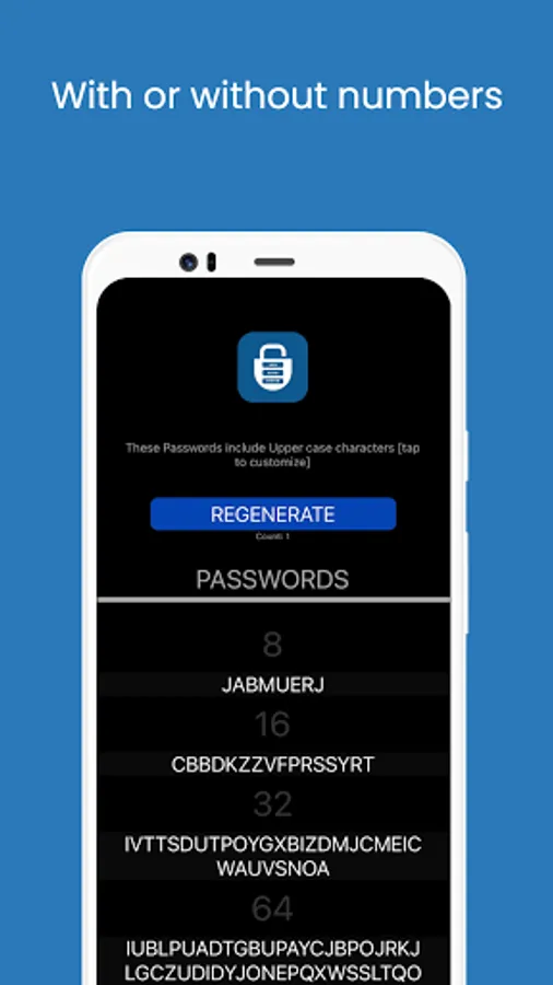 This password generator is not a password vault - this app does not save your passwords in a central password vault that will someday be hacked. The password is copied to your clipboard once, and you decide what to do with it.