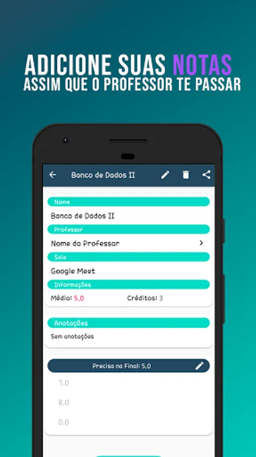 Easily manage your courses where you can register your grades as soon as you receive them, without waiting for posts on the portal. Register teachers and your email to avoid searching, as well as your schedule and set the reminder for the beginning of the class and events such as exams, assignments, activities and any other type of event and don't forget anymore, because you can register one reminder too;)