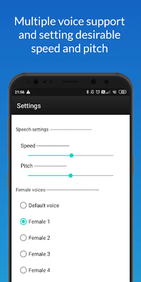 It has 11 FEMALE voices. You can choose any one of them. You can set the SPEED and PITCH of the voice.