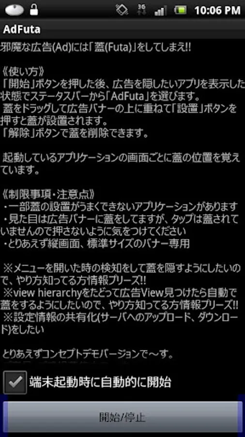 After pressing the "start" button, select "AdFuta" from the status bar in the state in which to display the apps that want to hide the ad.