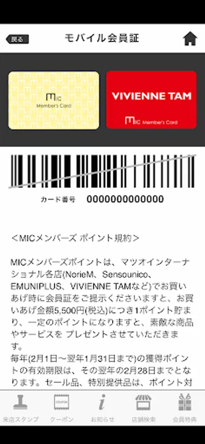 "MIC Members electronic membership certificate official app" is an application which you can use as a membership card in stores Matsuo International Co., Ltd. is operated.