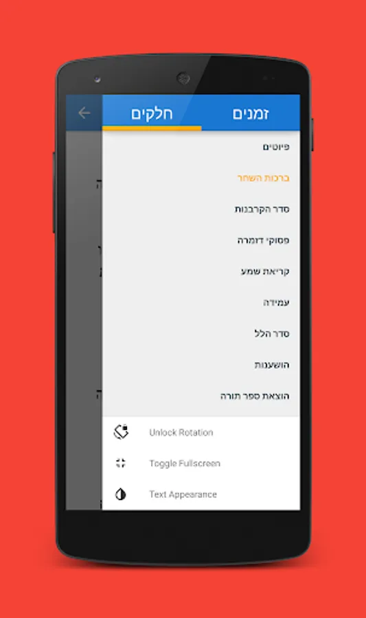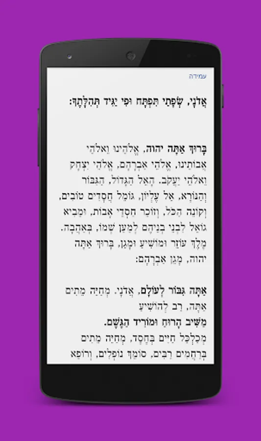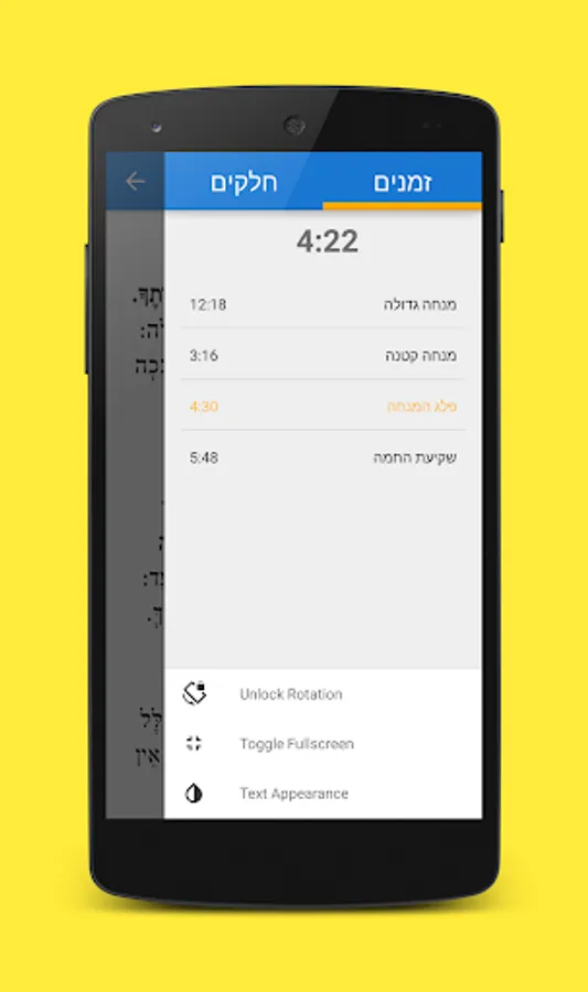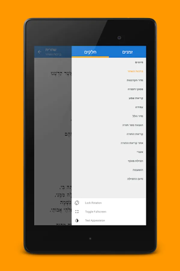 Now you can choose between five different fonts, change the text size and set an appearance theme. You can also set the siddur to silence your device while davening. When you're done, exit with a backpress to reset your device's volume.