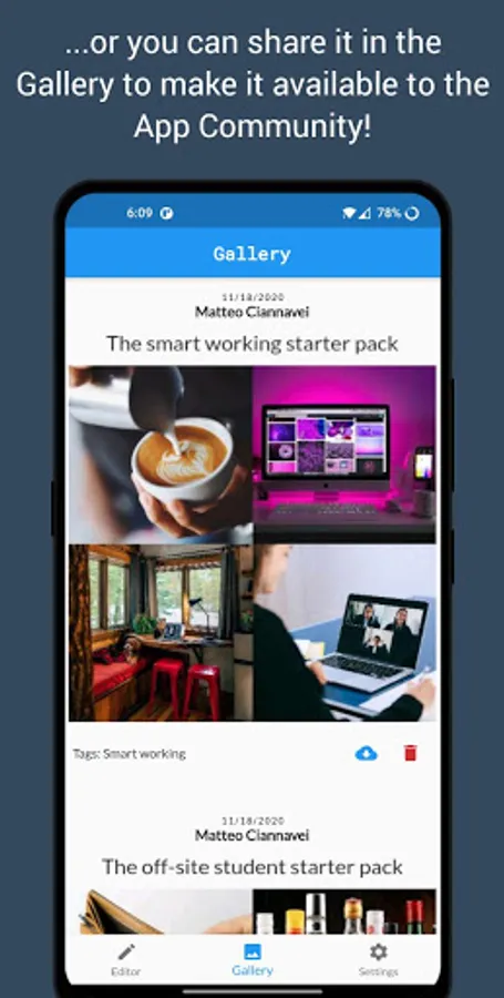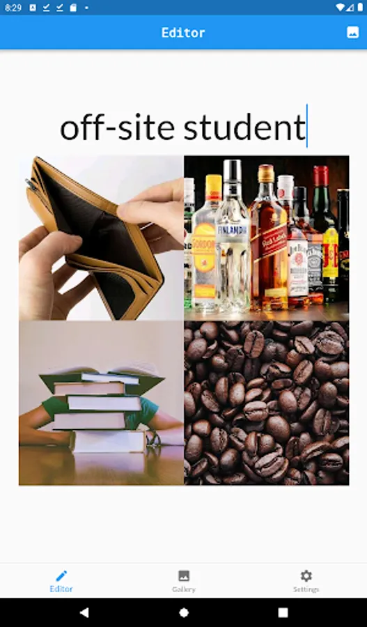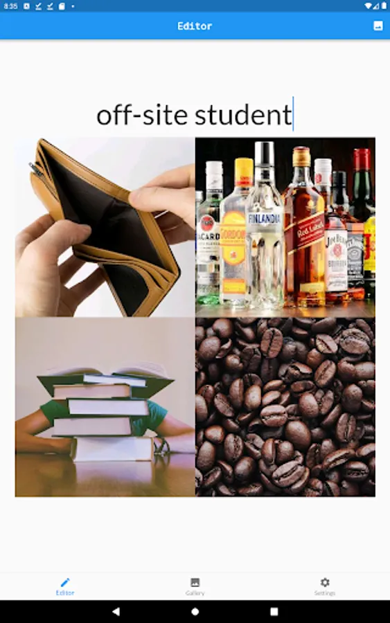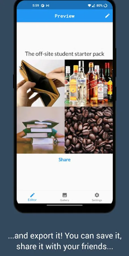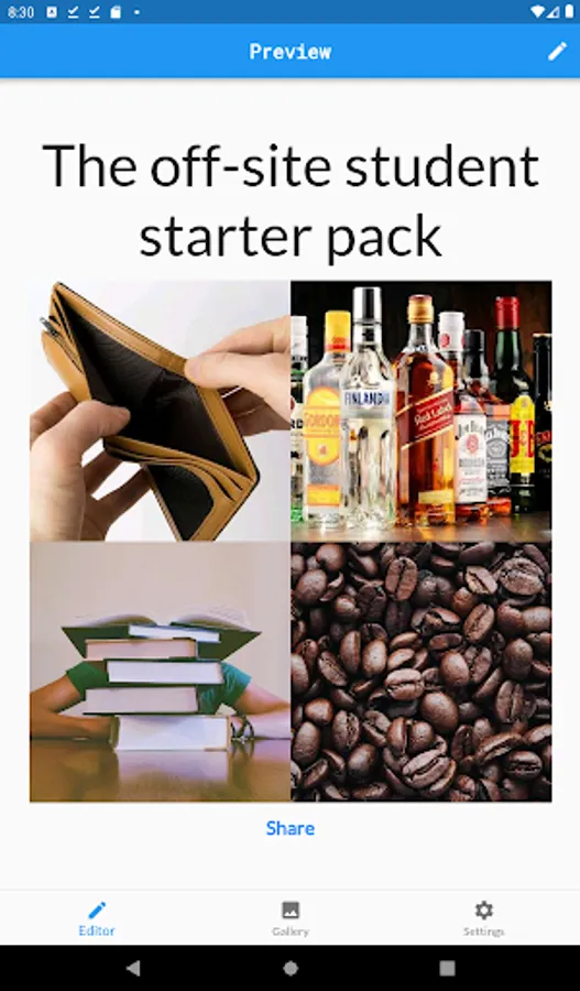Gallery contains all the memes created by other users, and you will be able to browse them by tags (for example “school, university”) and to share them with your friends.