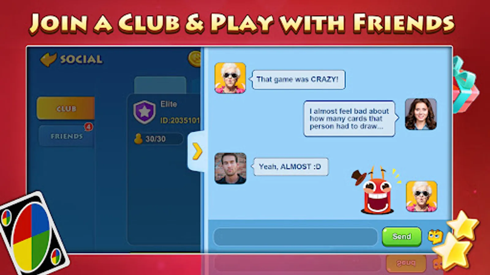Connect with your buddies in UNO!™ with clubs and send each other gifts. Make a strategy and remember to shout UNO before anyone else.