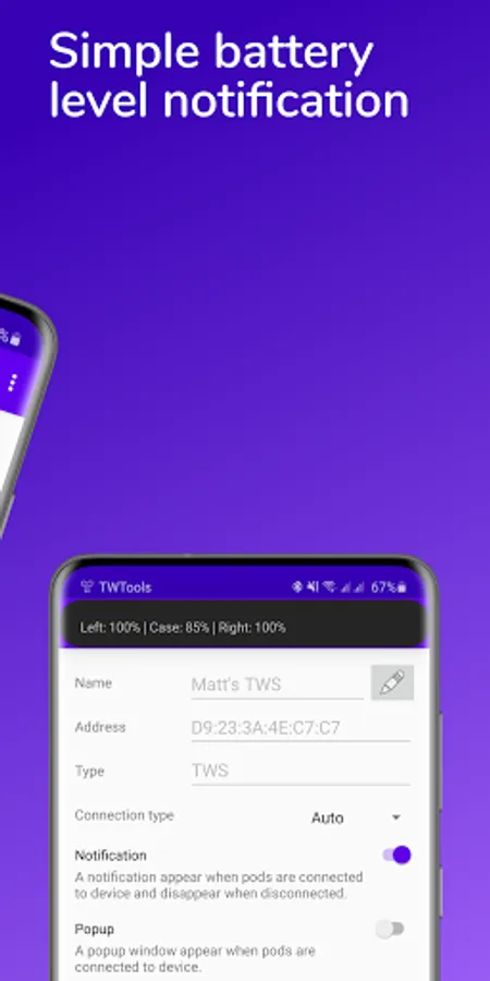 TWTools Pro stands for "True Wireless Tools". It's a simple tool that let you check the correct battery status of i500 TWS pods, original AirPods, AirPods Pro, AirPods Max, Beats and other clones.
