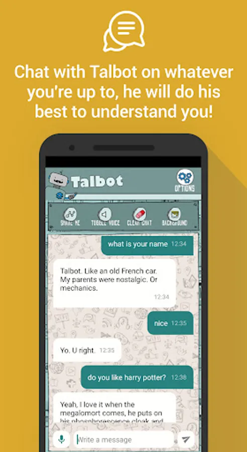 Talbot is constantly updated, he learns every day and every week his replies are improved ... so come back often to talk to him, always keep him with you for a quick chat and amaze your friends with this incredible chatterbot!