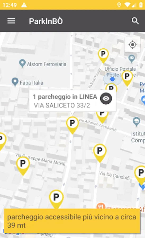 By opening the app you will see the parking spaces reserved for cars with the H mark that are near you: click on the placeholder to get a detailed description of the type of parking area (places available, type and address).