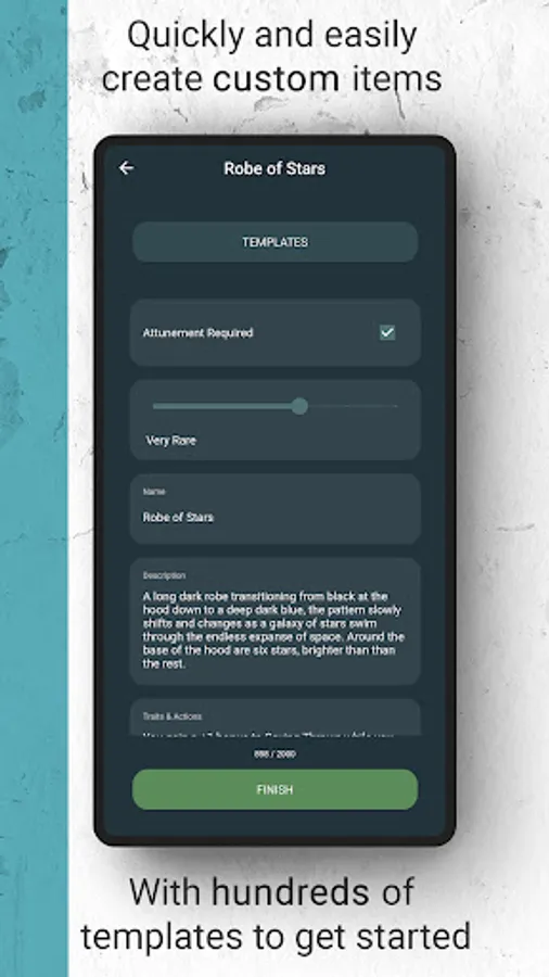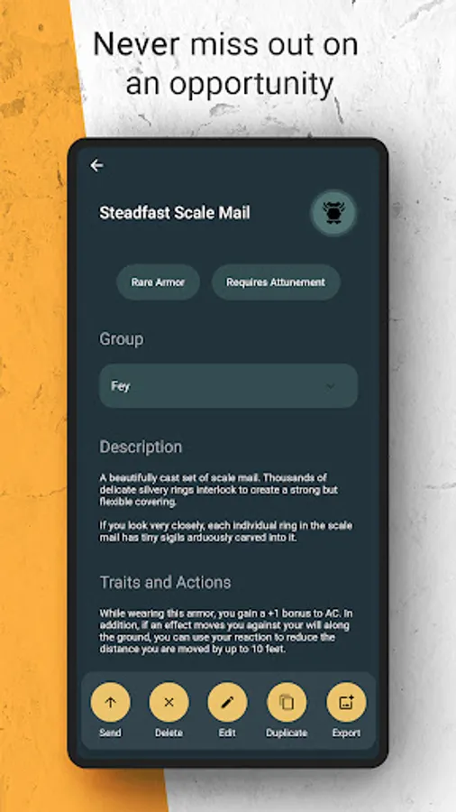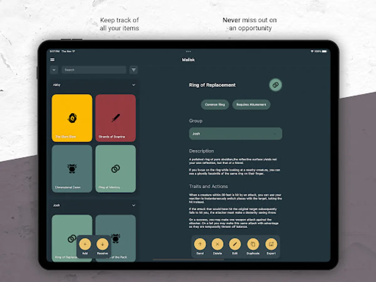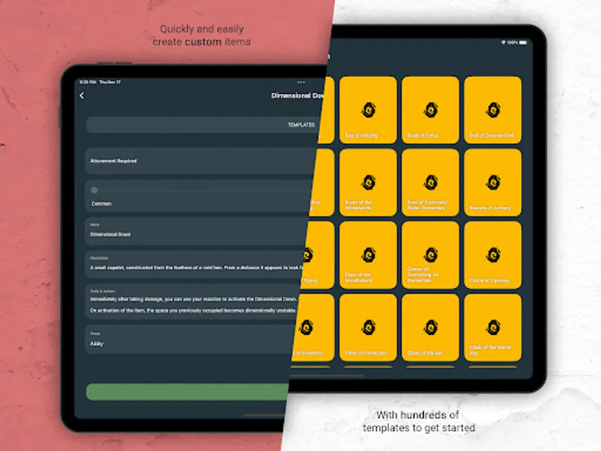 D&D Homebrew Items helps you keep track of magical items in your D&D campaigns. Think of it as a bag of holding for all the magical loot you pick up through the campaign. Never again miss an opportunity in the heat of battle because you forgot about that one clutch item.