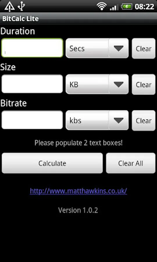 BitCalc Lite allows you to quickly calculate duration, file size and bitrate for video encoding projects. Specify two of the parameters and BitCalc Lite will calculate the third.