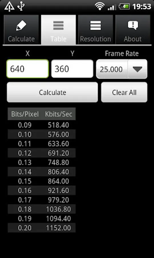 BitCalc Pro will also calculate bitrates for a specified resolution and frame rate for various "bits per pixel" values. This allows you determine a good starting point for a specific video if you are unsure what bitrate to try first. The results are calculated for a range of 0.09 bits per pixel through to 0.2 bits per pixel. These values are used by many well known media broadcasters.