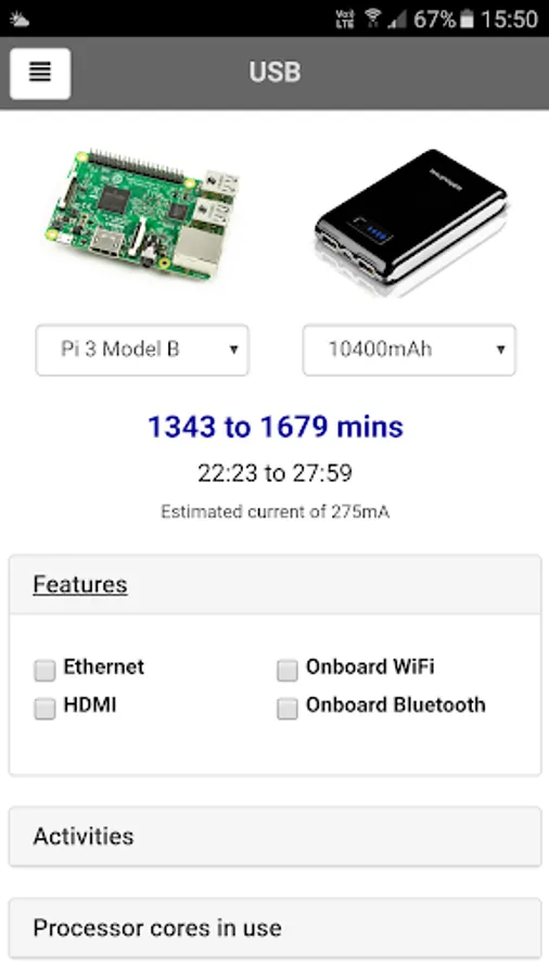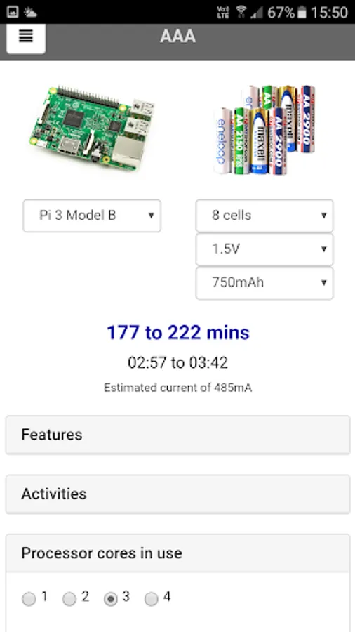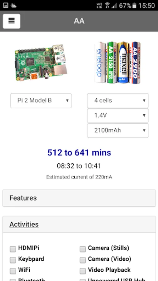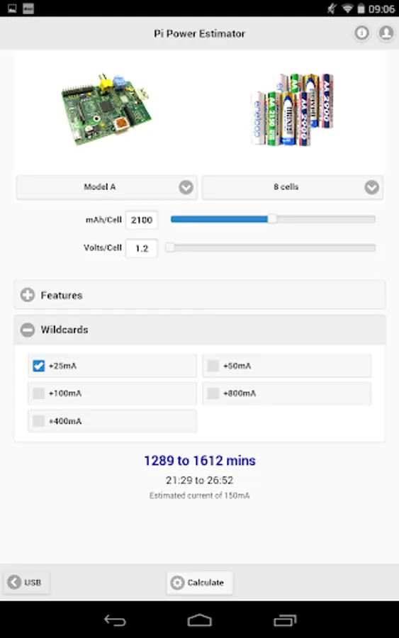 Pi Power Estimator allows you to calculate the run-time of a Raspberry Pi running from a USB power bank, set of AA/AAA batteries or a single PP3 9V battery.