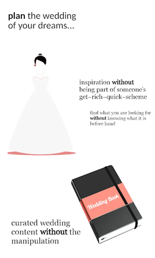 Wedding Book is a new way to consume wedding-focused content. Like our sister platforms, Catlicked and Elephant Ears, it relies on some fundamental principles. First, some people don't know what they are looking for when they get on the internet. They want to be inspired. Machine learning algorithms show you what you like based on what they already know about you. Ironically enough, most people don't have their dream wedding more than a couple of times in one lifetime. Machine learning algorithms will never know enough about you to give you quality content when it comes to planning your wedding. Don't believe me? Just search for wedding related content in your favorite search engine. You'll notice: there just isn't relevant content. This is bad for people planning their wedding but even worse for people trying to get inspired.