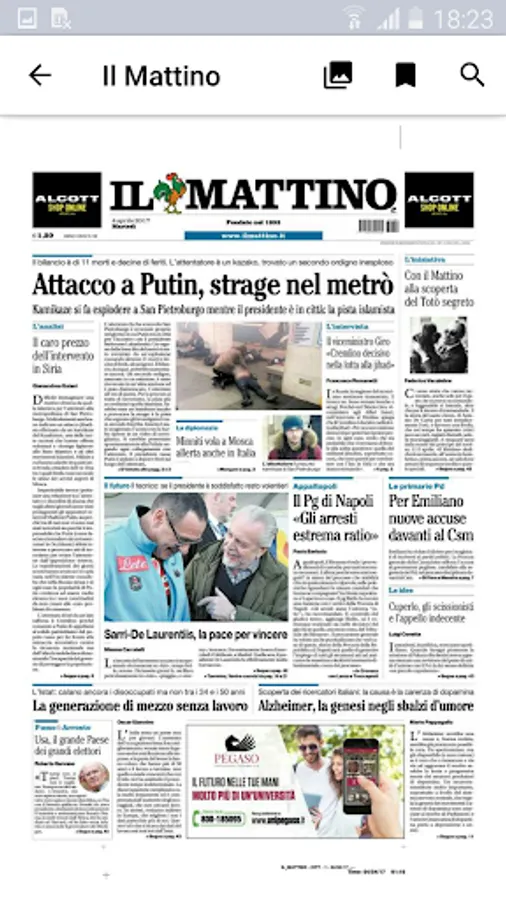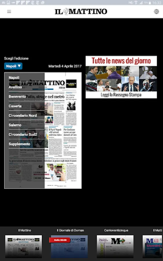 You will be able to access the daily news as well as browsing through the various sections also by accessing the "In Newsstand" or "Il Mattino" - "Newsstand" area. The editions of Naples, Avellino, Benevento, Caserta, Circondario Nord, Salerno, Circondario Sud, available from the early hours of the morning not only online but also offline once downloaded. And every day from MEZZANOTTE Il Mattino anticipates for its Readers the complete edition of the Giornale di Domani published only digitally. You will be able to access and consult the attachments and the newspaper's specials, browse the editions of the last 14 days and save them on your devices.