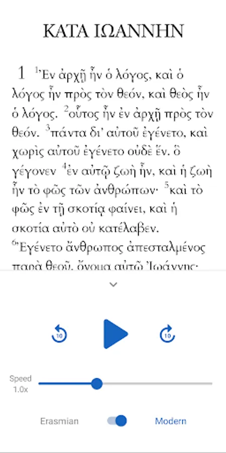 - Audio: audio playback available for every chapter, in Erasmian or Modern pronunciation