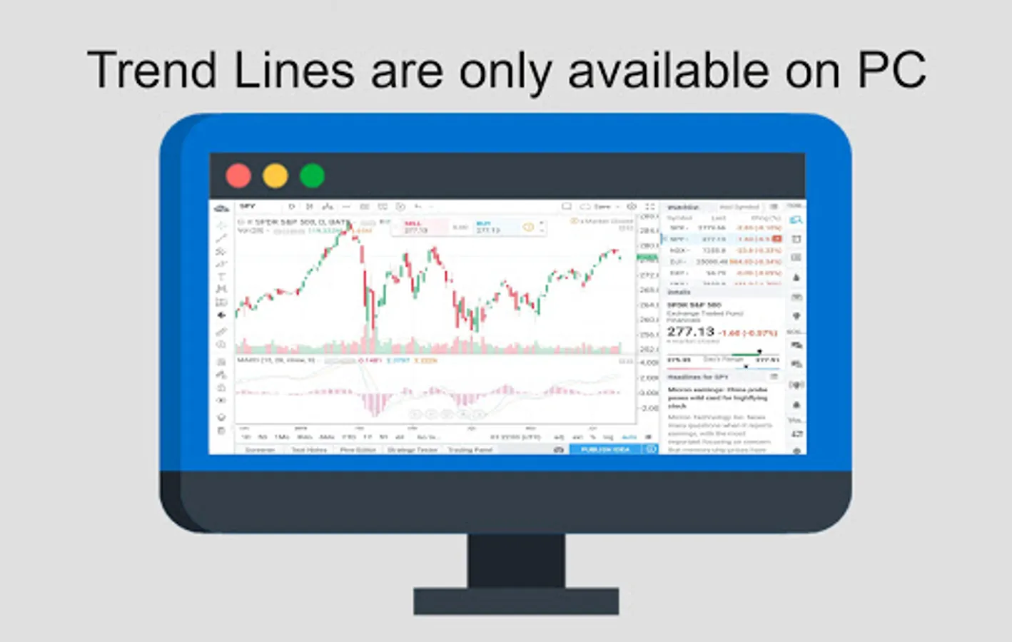 -This is a very simple app: it is a web browser set for desktop mode with its homepage set to an online stock chart. Some features available on a computer will not work in the app. You cannot draw trend lines. It is only designed to view a full screen chart.