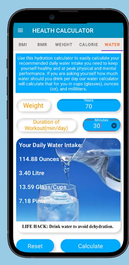 5.Use this hydration calculator to easily calculate your recommended daily water intake you need to keep yourself healthy and at peak physical and mental performance. If you are asking yourself how much water should you drink per day our water calculator will calculate that for you in cups (glasses), ounces (oz), and milliliters.
