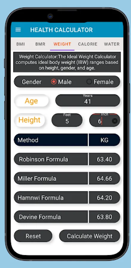 3.Weight Calculator:The Ideal Weight Calculator computes ideal body weight (IBW) ranges based on height, gender, and age.