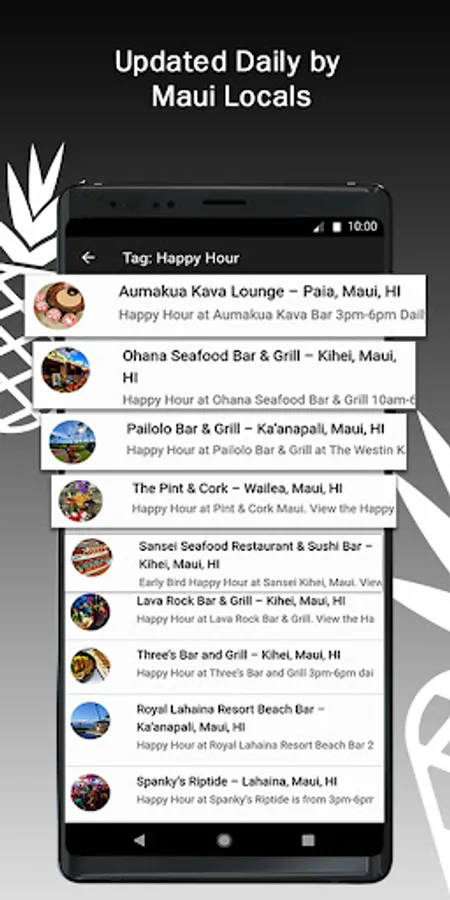 Maui Happy Hours is a team of Maui locals curating the best happy hours, deals, and discounts at Maui bars, restaurants, and businesses. Use the Maui Happy Hours app to try food and drinks at the best Maui restaurants and bars for a fraction of the normal cost.