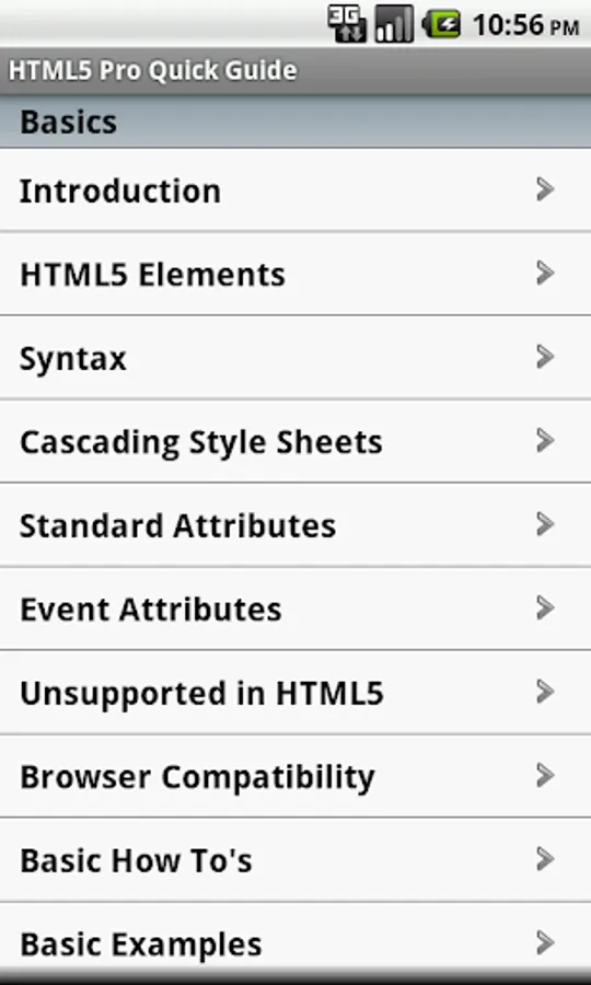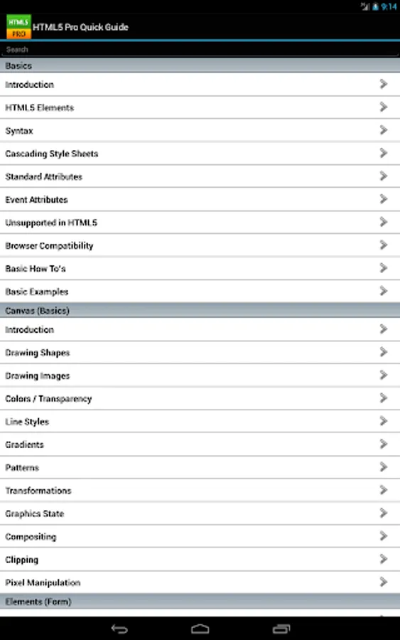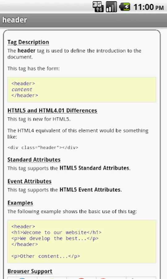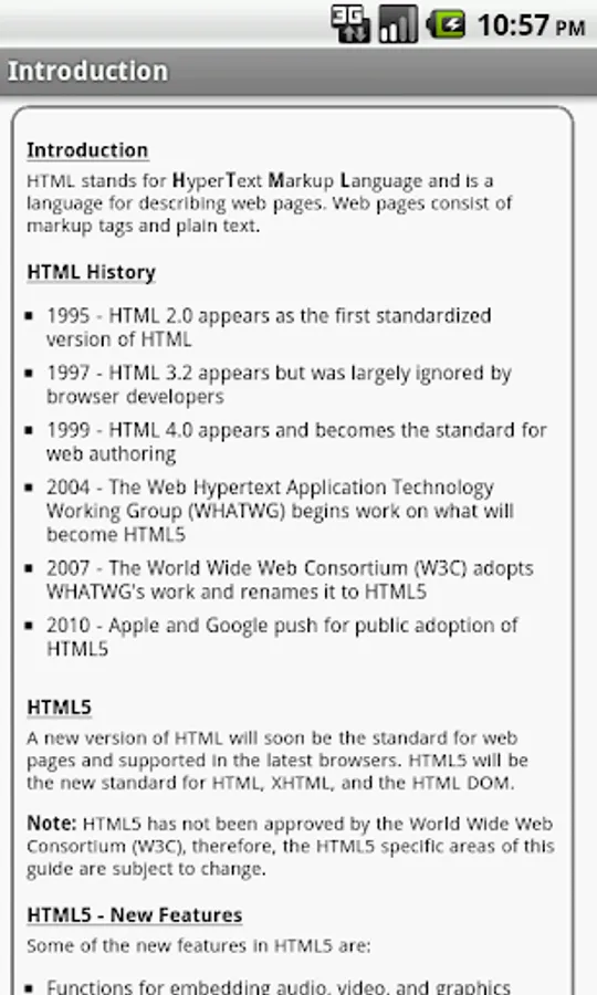 Note: This app contains HTML4 information, but the goal is to focus on HTML5. As the HTML5 specification progresses towards approval, updates to this app will follow those changes and evolve toward the HTML5 spec.