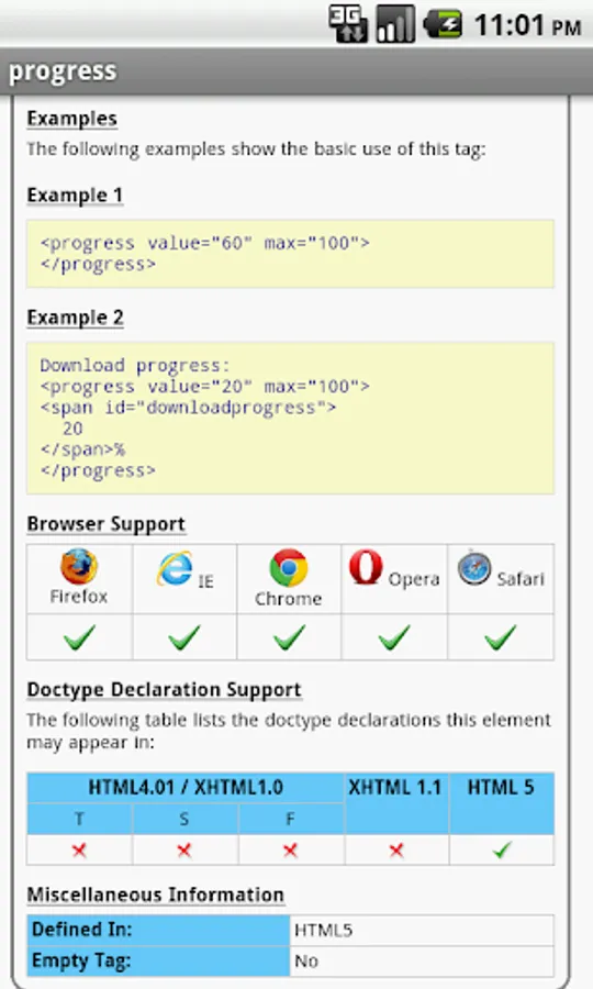 The HTML tags are categorized and searchable. Each tag information screen contains a description, element specific attributes, examples, browser compatibility, and version information. In addition, many of the examples include the actual rendered output.