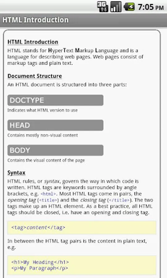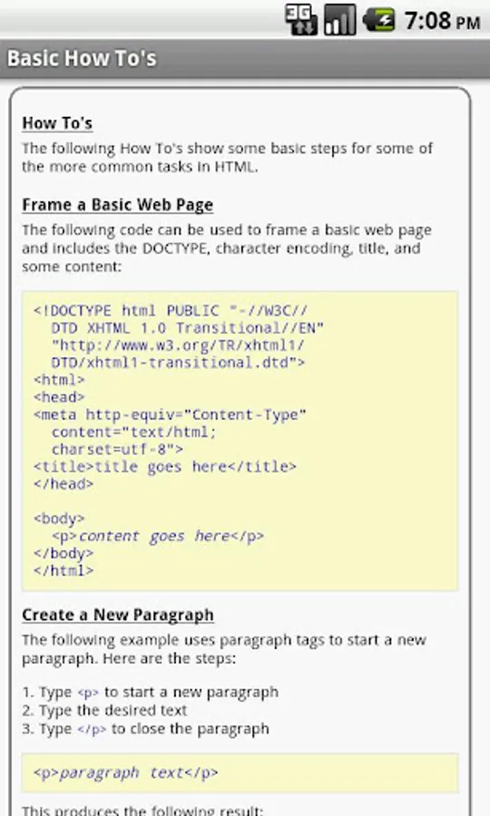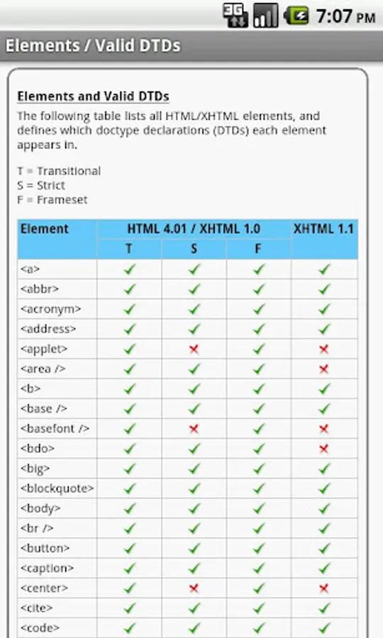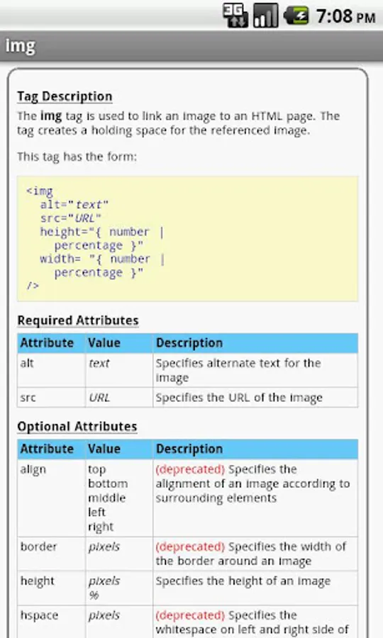 The HTML tags are categorized and searchable. Each tag information screen contains a description, standard and optional attributes, event attributes, examples, browser compatibility, valid DTD table, and version information. In addition, most of the examples include the actual rendered output.