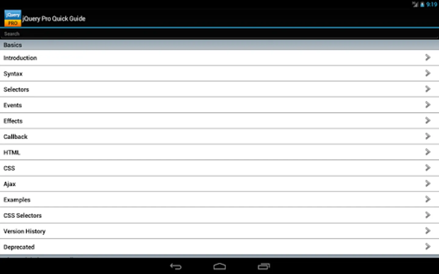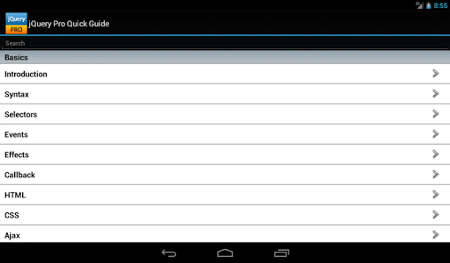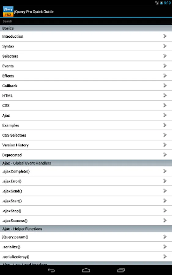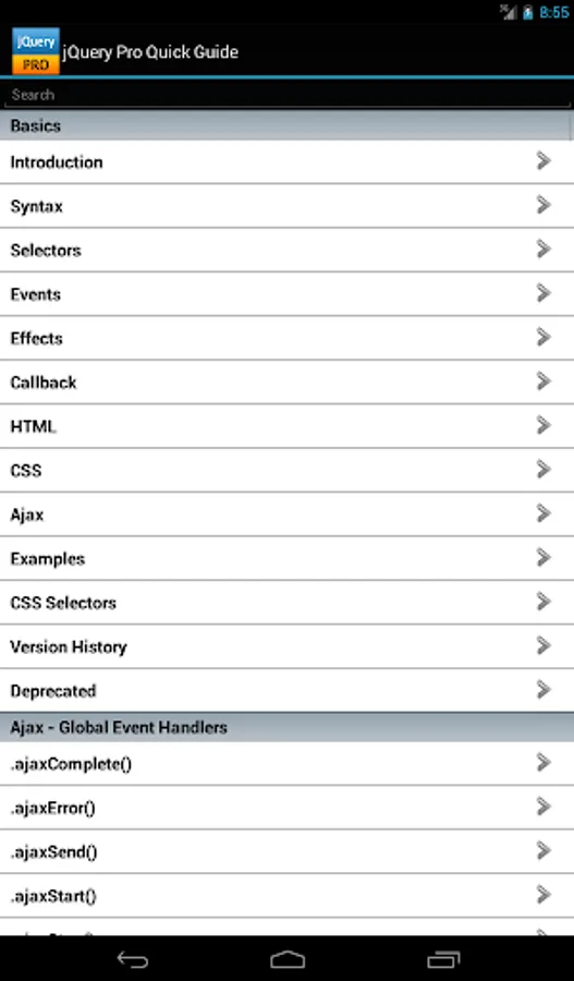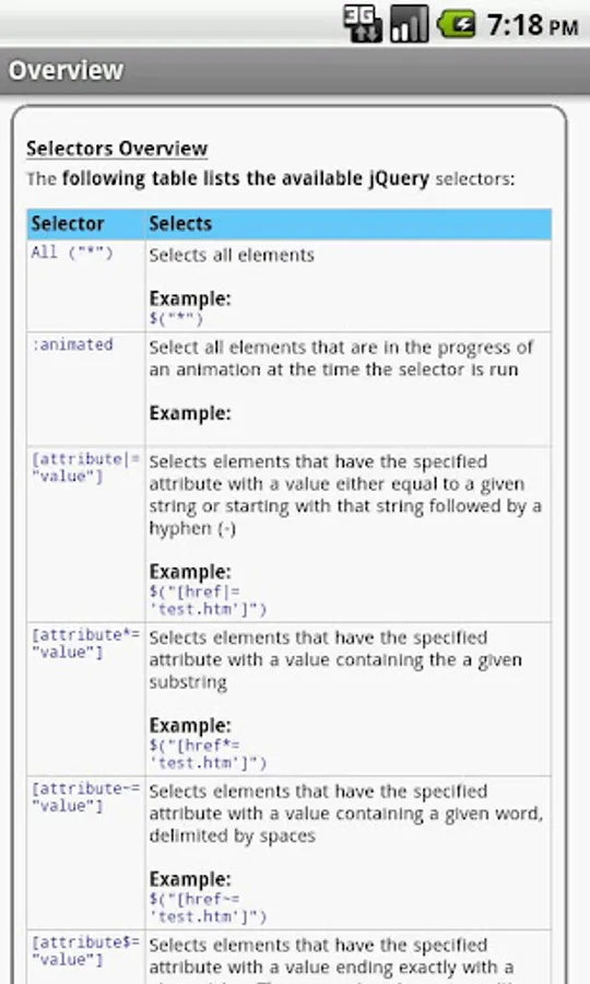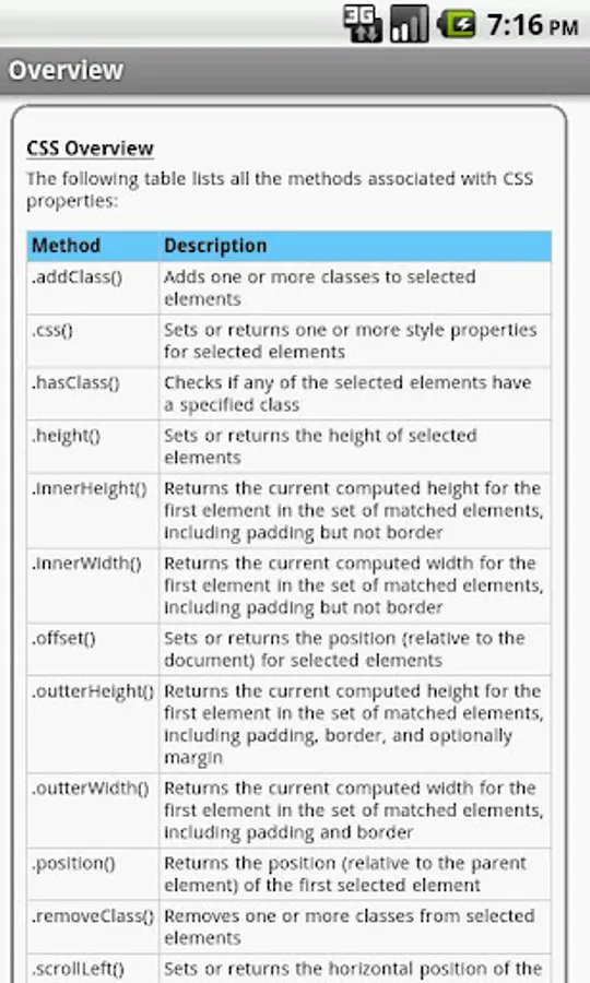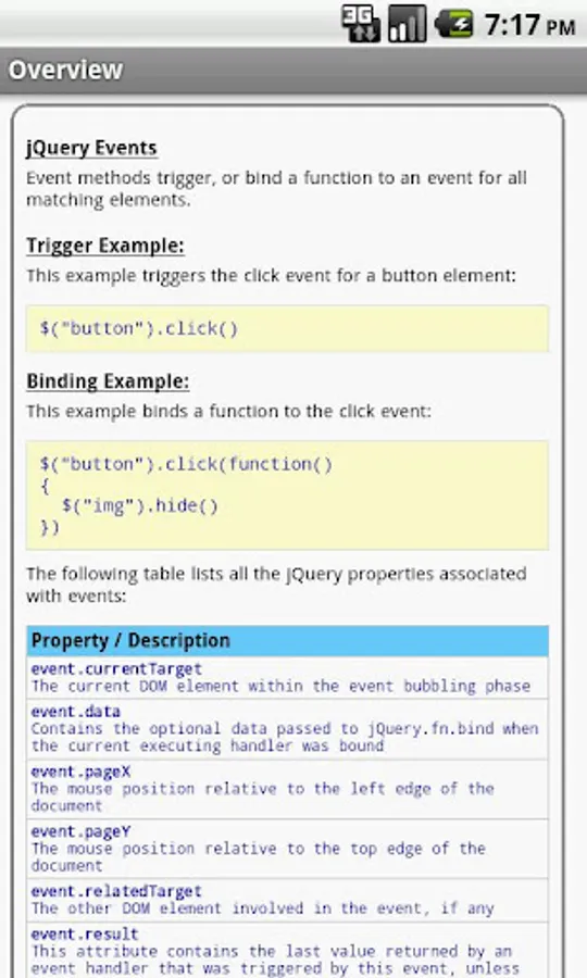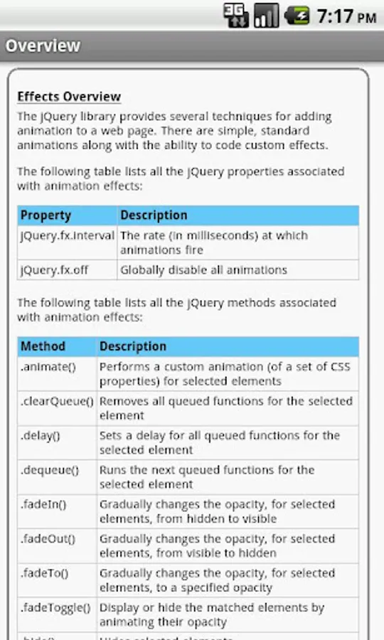 The jQuery properties/functions/methods are categorized and searchable. Each detailed information screen contains a description, parameters, examples, browser compatibility, and more. In addition, most of the examples include the actual output.