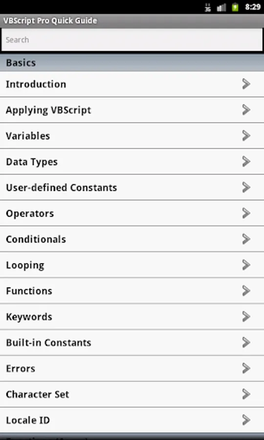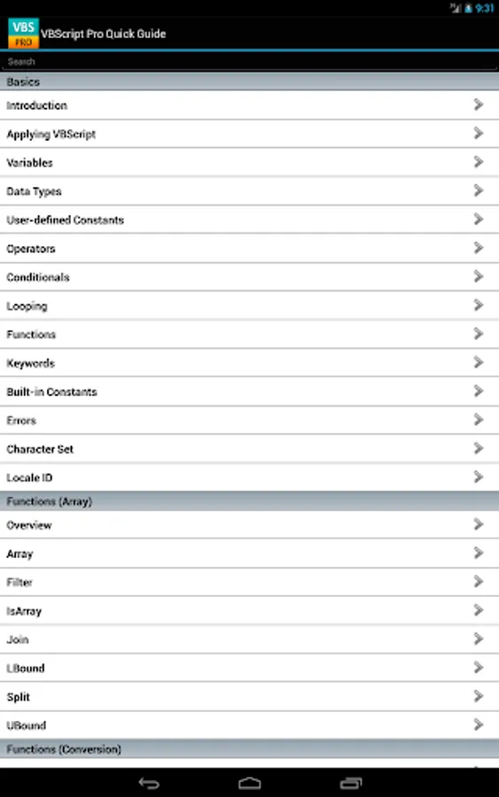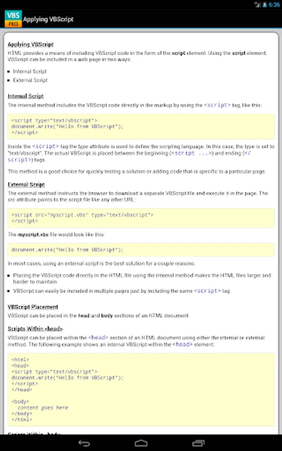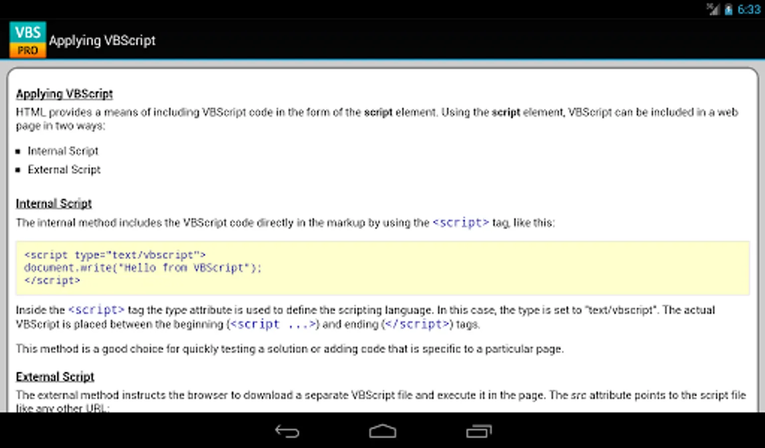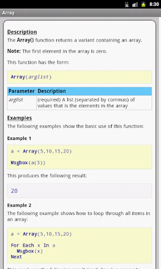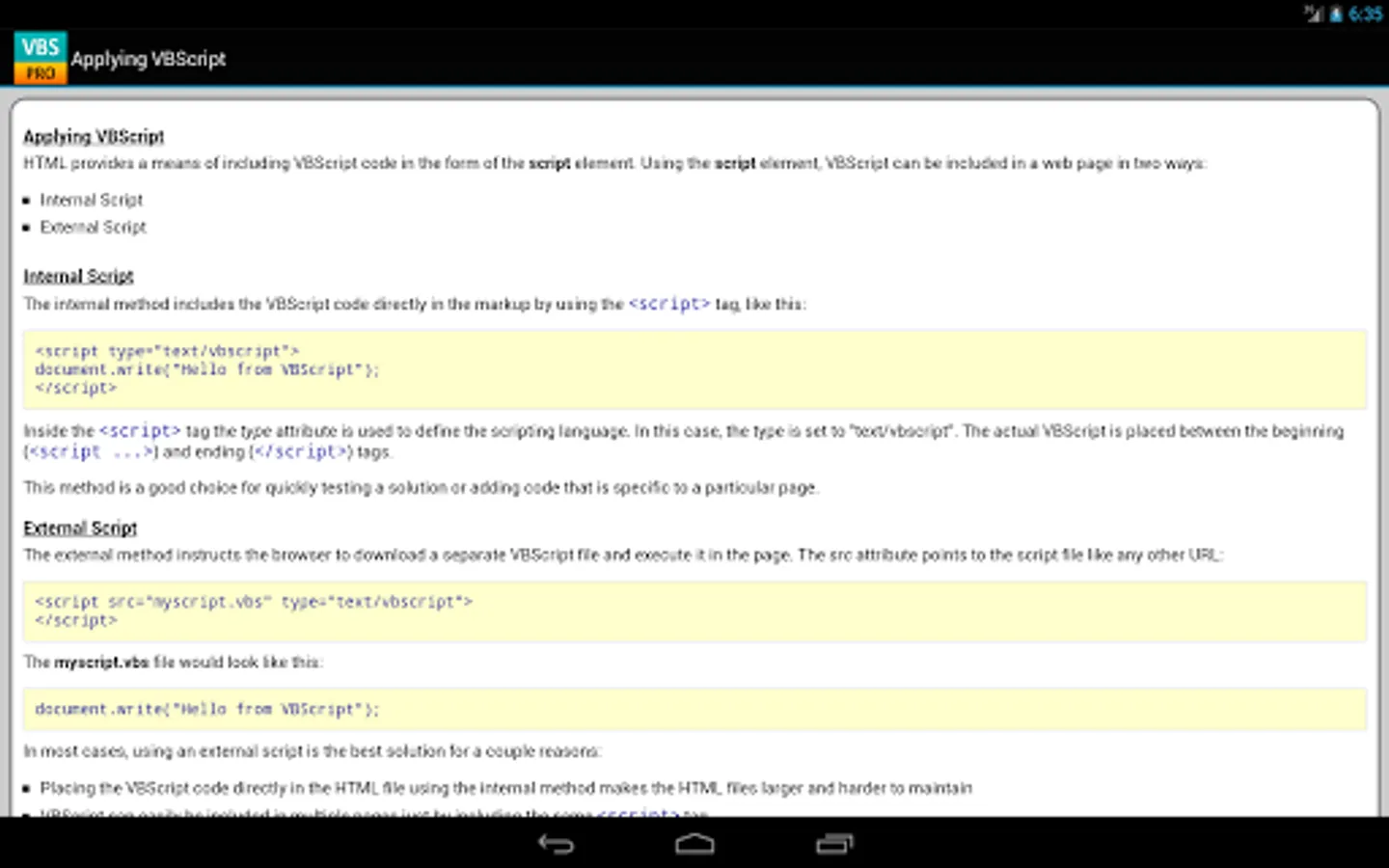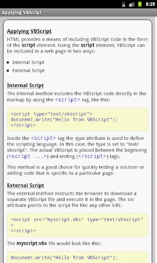 The VBScript properties/functions are categorized and searchable. Each detailed information screen contains a description, syntax, parameters, examples, and more. In addition, most of the examples include the actual output.
