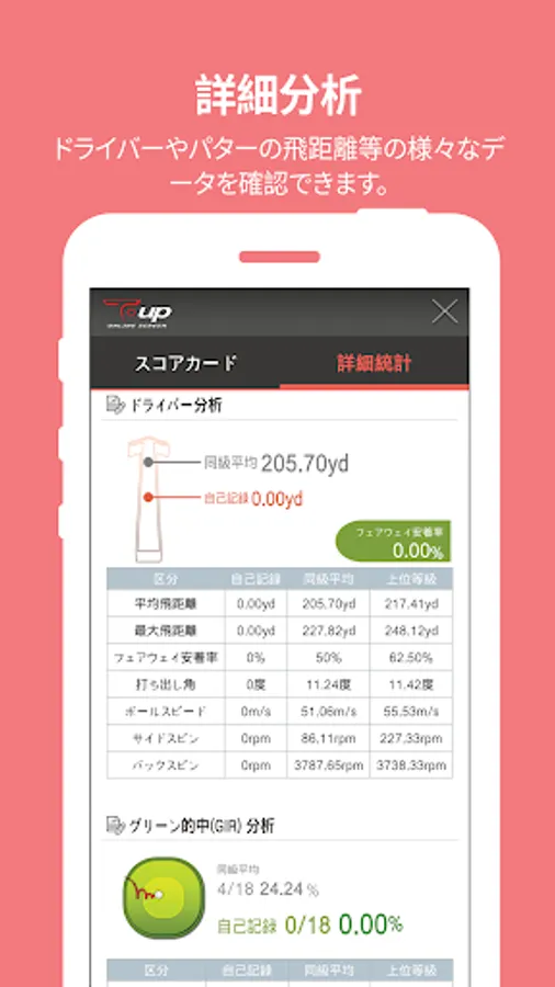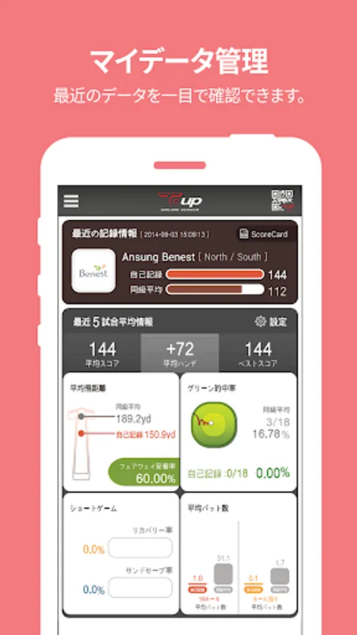 When you open the app, you can check your average data by statistics. Check your round records, including average score, average number of puttings, and highest score.