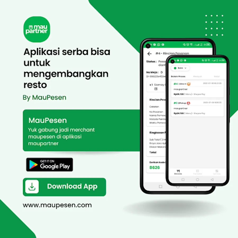 MauPartner is a merchant application from MauPesen to help MauPesen Business Partners develop their business. MauPesen is not just a food ordering application but a super complete application with various ordering methods.