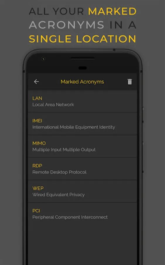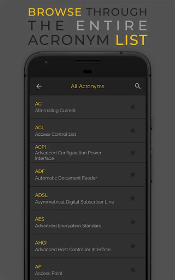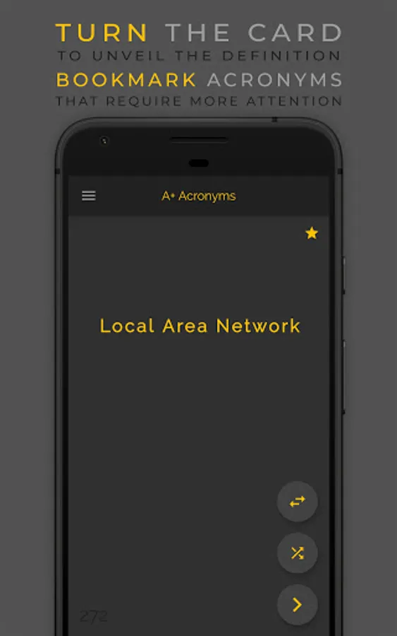 The PRO version gives you access to all in-app features such as viewing your marked acronyms and browsing through all acronyms listed in the CompTIA A+ exam objectives, this gives you the ability to view and search for a specific acronym.